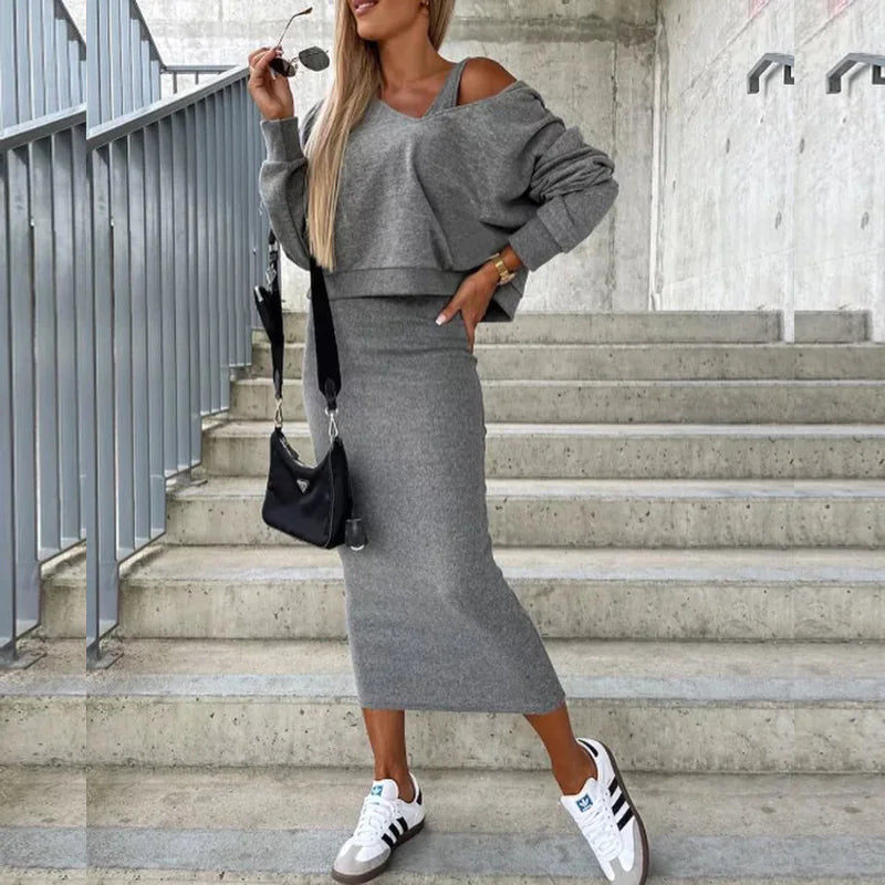 Elevate your style with our Women's Fashion Two-Piece Dress Set. This stunning set features a sexy deep V-neck top and a flattering mid-calf dress, perfect for any occasion. The comfortable and stylish design makes it ideal for both casual and formal wear.